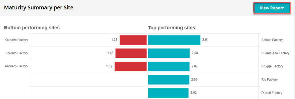 This report highlights your top and bottom performing sites, ranking them by their averaged maturity across all practices.