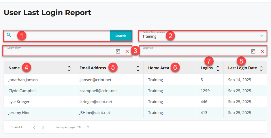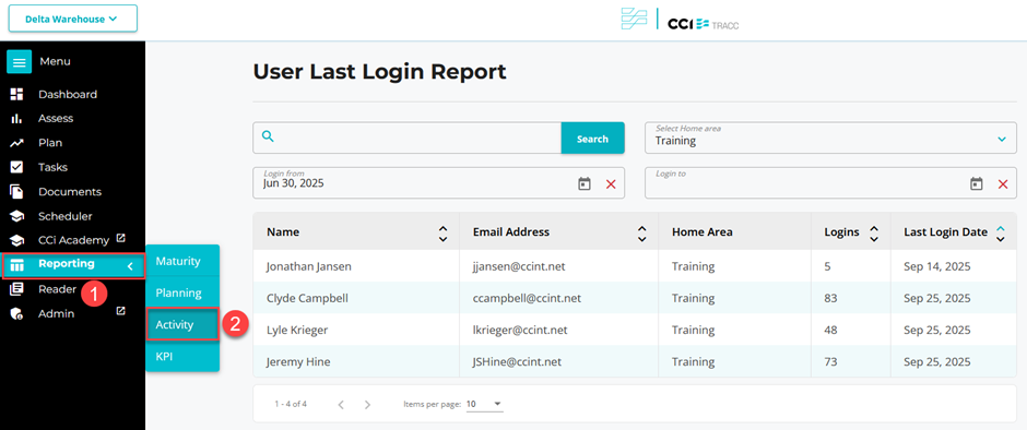 - View the amount of times a user logged into the TRACC Platform between the provided date range.