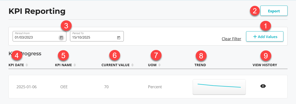 - View the KPI dates (this is updated according to when the last KPI value was inserted). If you insert a KPI value today, it will reflect today's date.