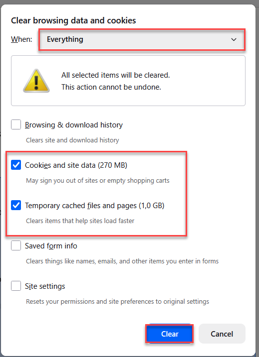 Select the check boxes for Cookies and site data and Temporary cached files and pages.
