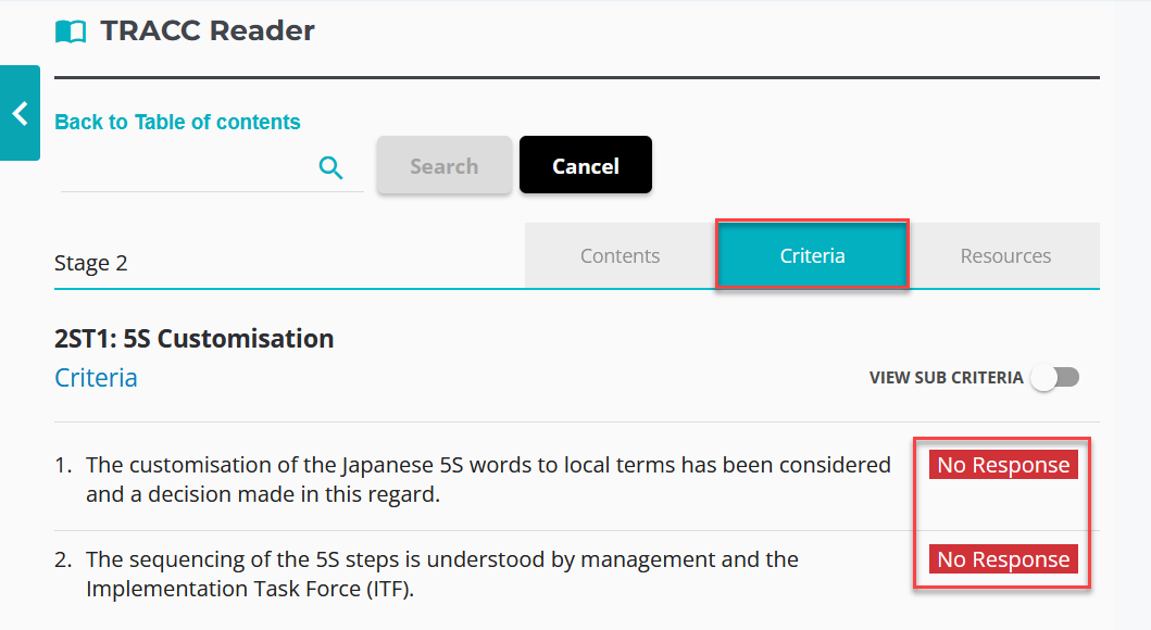 The criteria will also indicate the response to the criteria.
