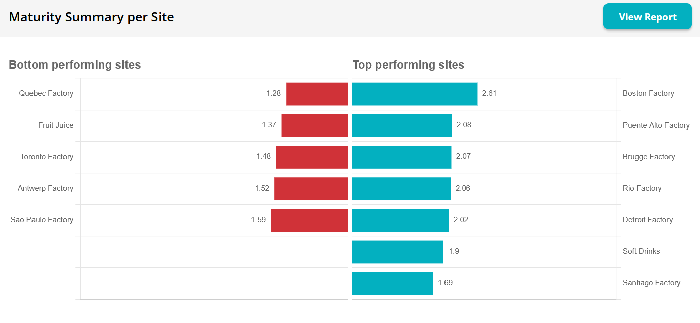 3. The Maturity Summary per Site Report highlights your top and bottom performing sites, ranking them by their averaged maturity across all practices.