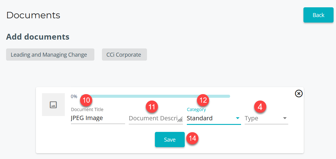 Select the document Category. Documents can be uploaded as evidence, standards or best practices.