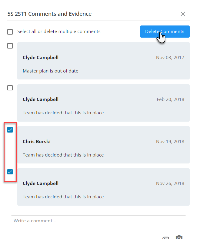 When copying assessments in the previous version of the Platform, any comments in those assessments were copied as well. In the migration to the new Platform, we've merged all comment history, resulting in those copied comments now displaying as duplicate comments. We've now introduced an easy way to quickly select multiple comments that you wish to remove from the comments and evidence view.