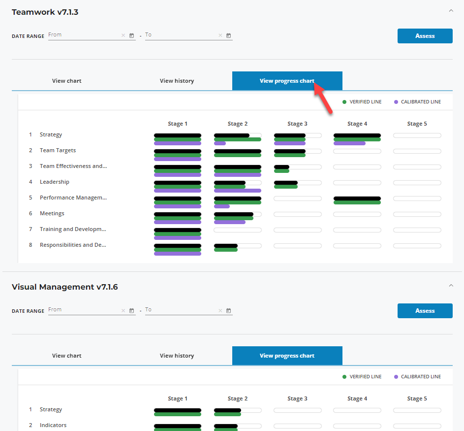 The assessment progress charts, previously accessible in the theme navigator when inside an assessment, has now been moved onto the assessment landing page. Multiple progress charts can now be displayed simultaneously.
